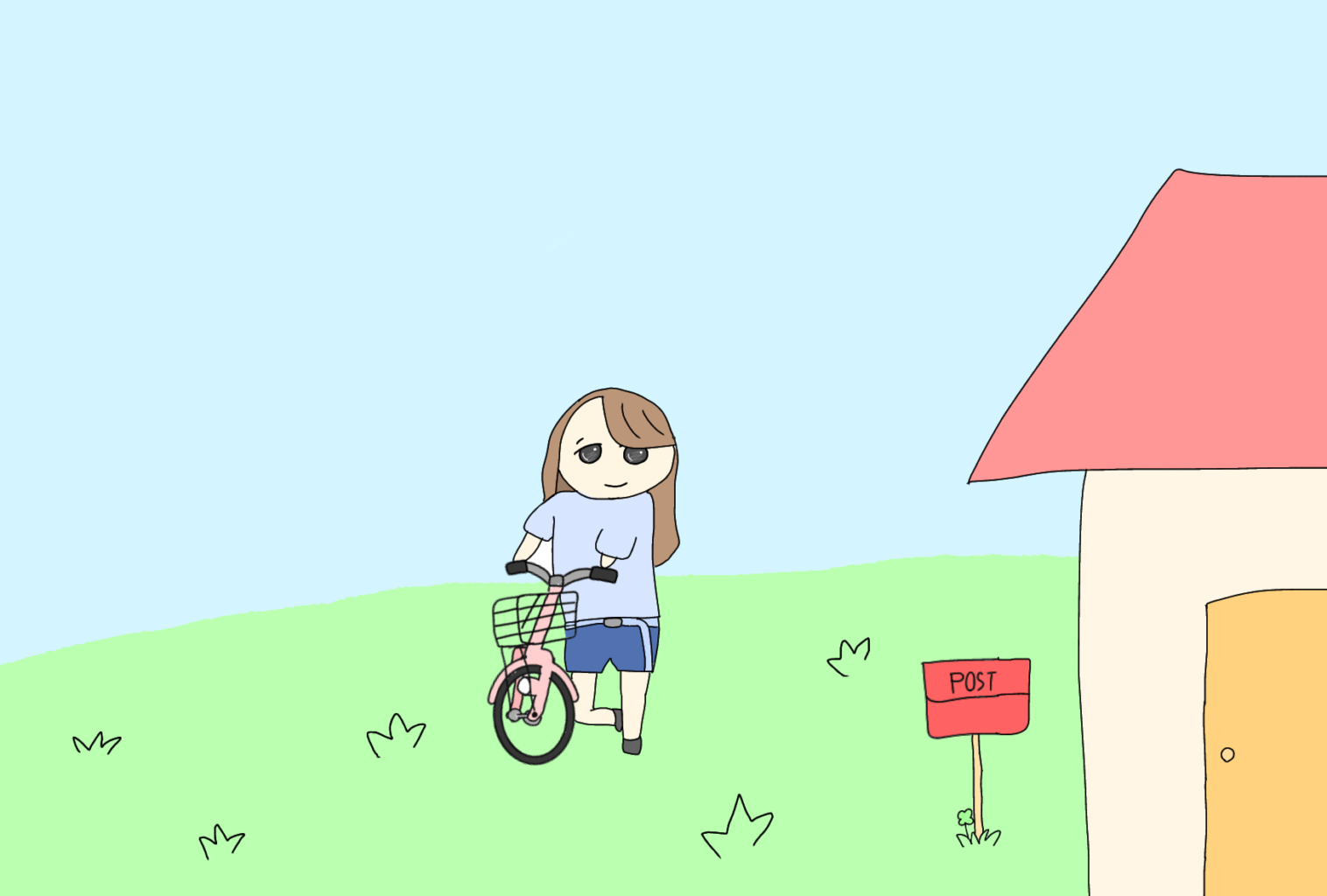 女の子が自転車を持っている風に描くのがむずかしかった…😑